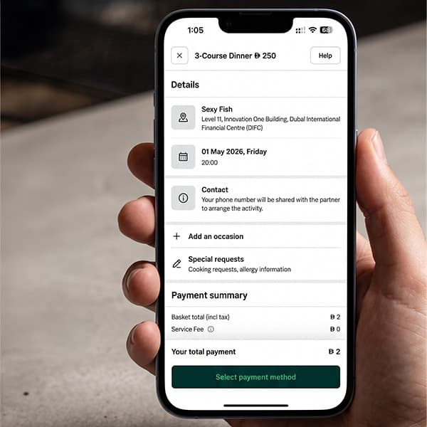 Once you’ve reviewed your details, simply tap “Select payment method” and complete your transaction. You will receive your booking confirmation instantly within the app and via email. There’s no need to call ahead – just turn up, mention your booking, and enjoy the experience!